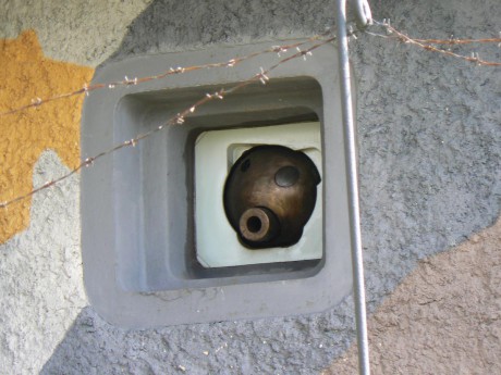 Vnější pohled na střílnu pro kasematní protitankový kanón vz. 36. Zbraň byla ve střílně uchycena kulovým pancéřovým štítem. Na Březince je kanón jen v levé střelecké místnosti, pravá místnost je vzhledem k terénu vyzbrojena jen kulomety.
