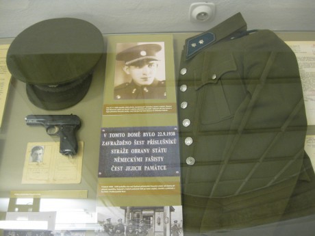 Uprostřed je pamětní deska z budovy bývalé četnické stanice v Liptani (okres Bruntál), kde byli zavražděni dva zajatí četníci a čtyři členové FS. (Četníci nebyli zařazeni u SOS.) Pistolí vlevo byli u FS vyzbrojeni jen úředníci.