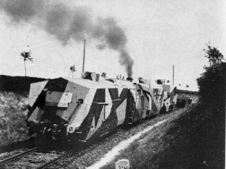Obrněné vlaky byly ve třech případech nasazeny proti sudetoněmeckým povstalcům. Pohled zezadu. Složení vlaku (odzadu): kulometný vůz, lokomotiva, kulometný vůz, dělový vůz, plošinový vůz. Foto: Internet
